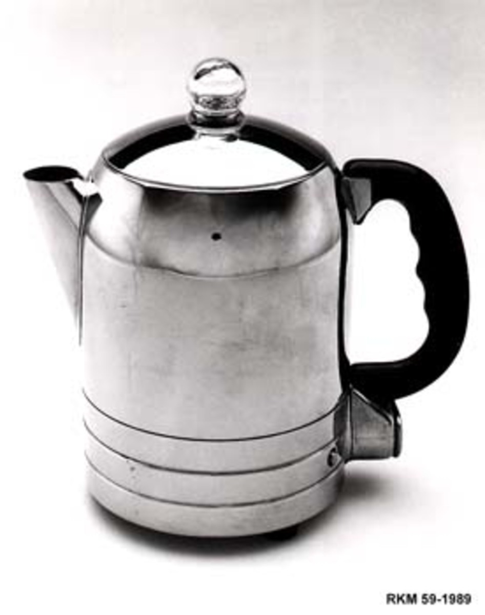 Elektrisk vattenkokare och kaffebryggare i aluminium med löst lock, lockknoppen av glas. Lös insats för kaffebryggning.