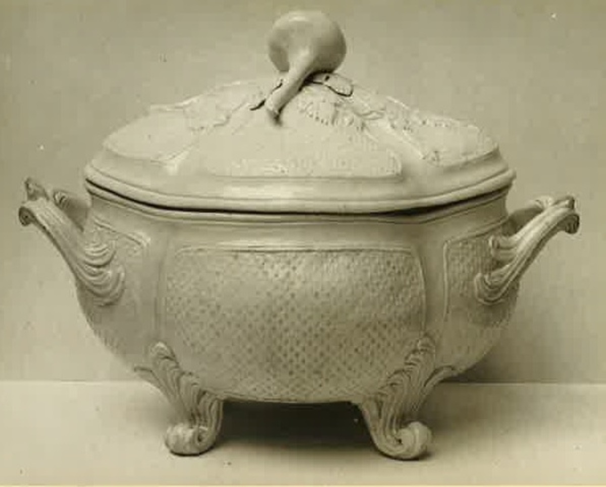 Terrin med lock i cremefärgat flintgods med dekor i relief. Utförd under Henrik Stens tid.