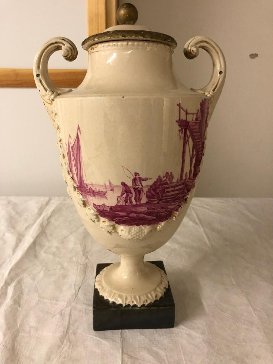 Urna med lock, av glaserat flintgods. Kring livet nedhängande lagergirlander i relief med guld ornering som innesluter en hamnscen målad i rött. Urnan har två uppåtböjda handtag samt står på ett svart postament. Utförd under H. Stens period.