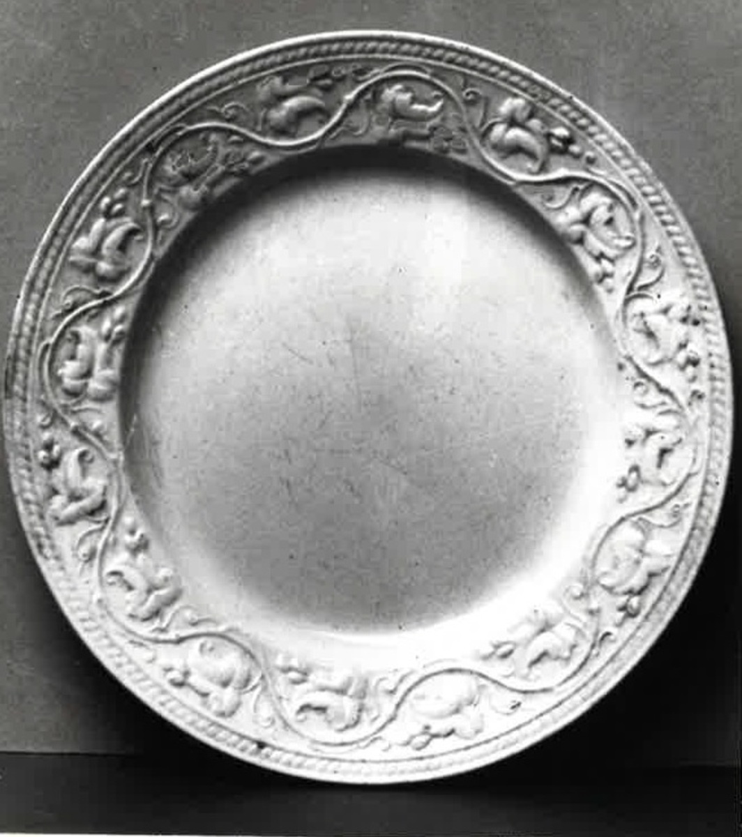 Flat tallrik av flintgods, med pressad brämdekor i form av vindruvsslingor. Gräddfärgad glasyr.