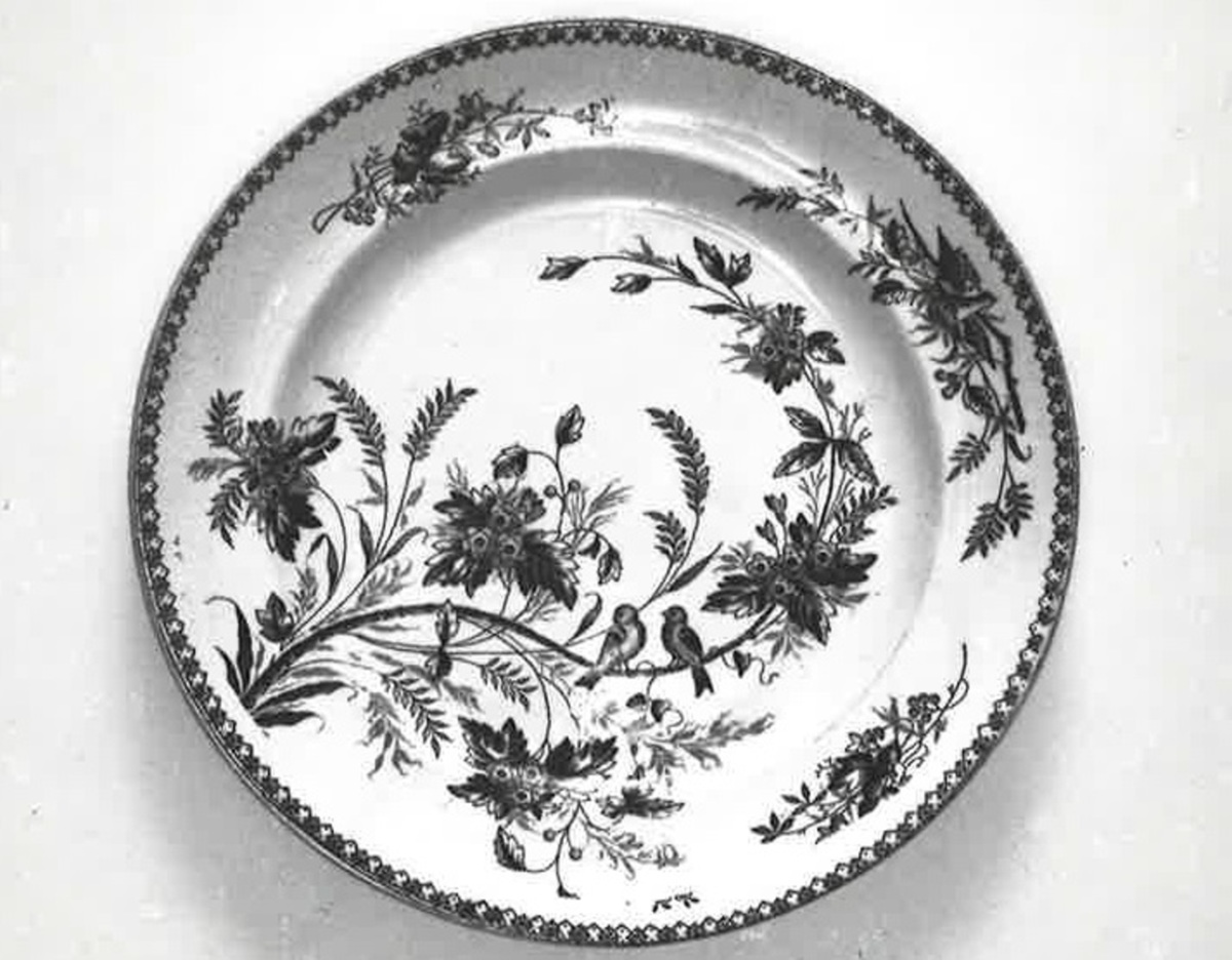 Flat tallrik av flintgods, ur servisen "Göteborg". Tryckt blå växtdekor.