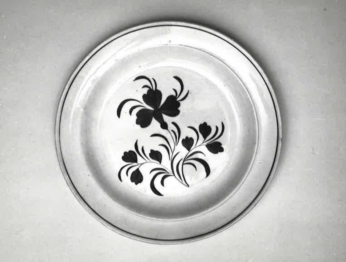 Flat tallrik av flintgods med blomdekor i blått och grönt och smala ränder i rött.