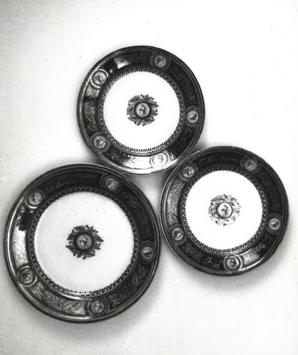 Delar ur servisen "Minerva", i flintgods (ironstone) med tryckt dekor i brunt och blått, dessutom guld och lyster över glasyren. En terrin med lock och tre tallrikar.