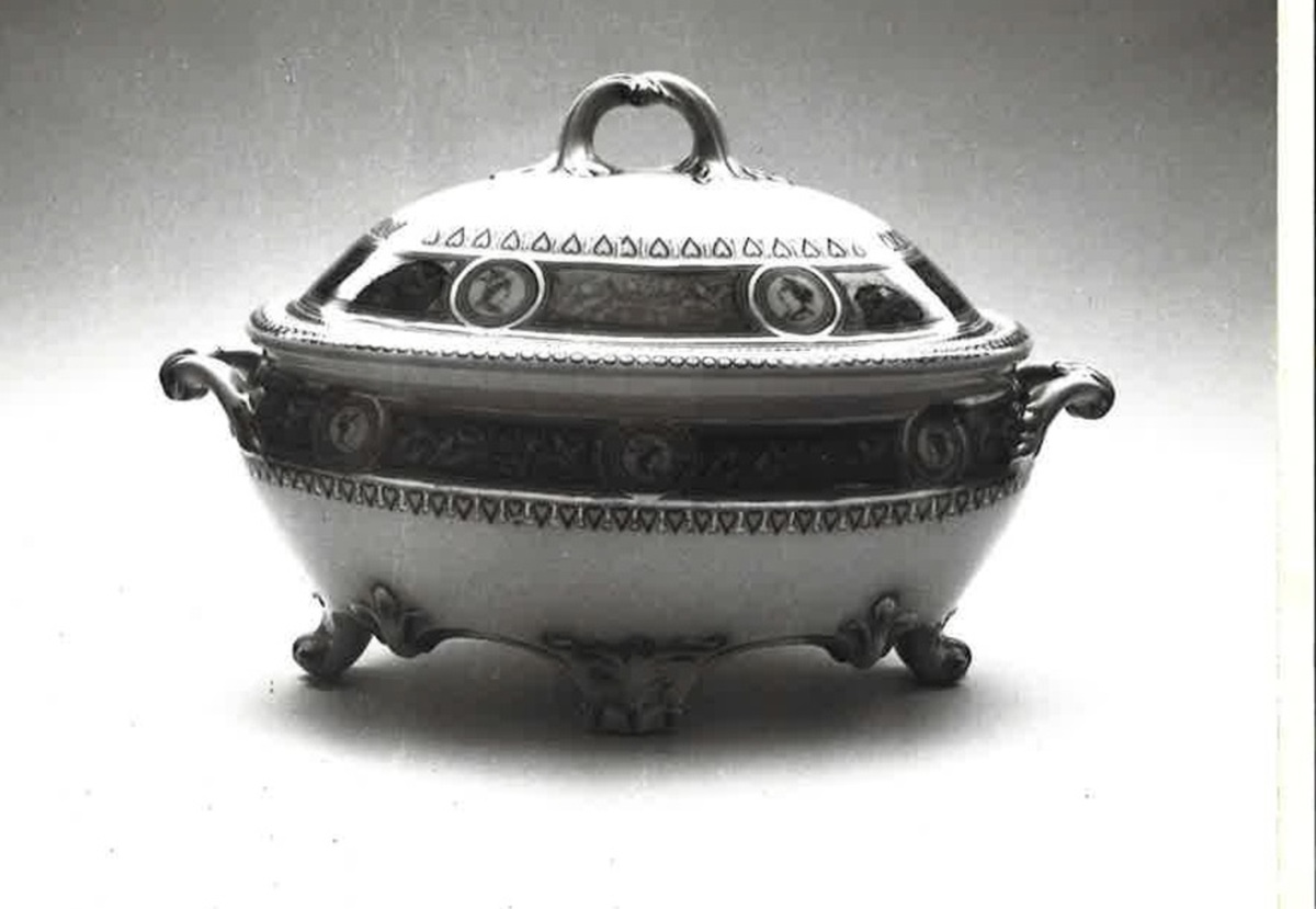 Terrin ur servisen "Minerva", i flintgods (ironstone) med tryckt dekor i brunt och blått, dessutom guld och lyster över glasyren.