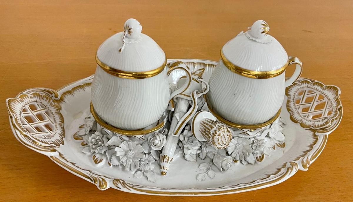 Bricka tête á tête av vitt porslin med dekor i guld. Två koppar med lock, av porslin med dekor i guld.