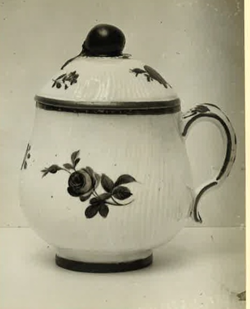 Krämkopp med lock av vitt räfflat porslin med dekor av mörkblå camaïeu-målning och gulddetaljer.