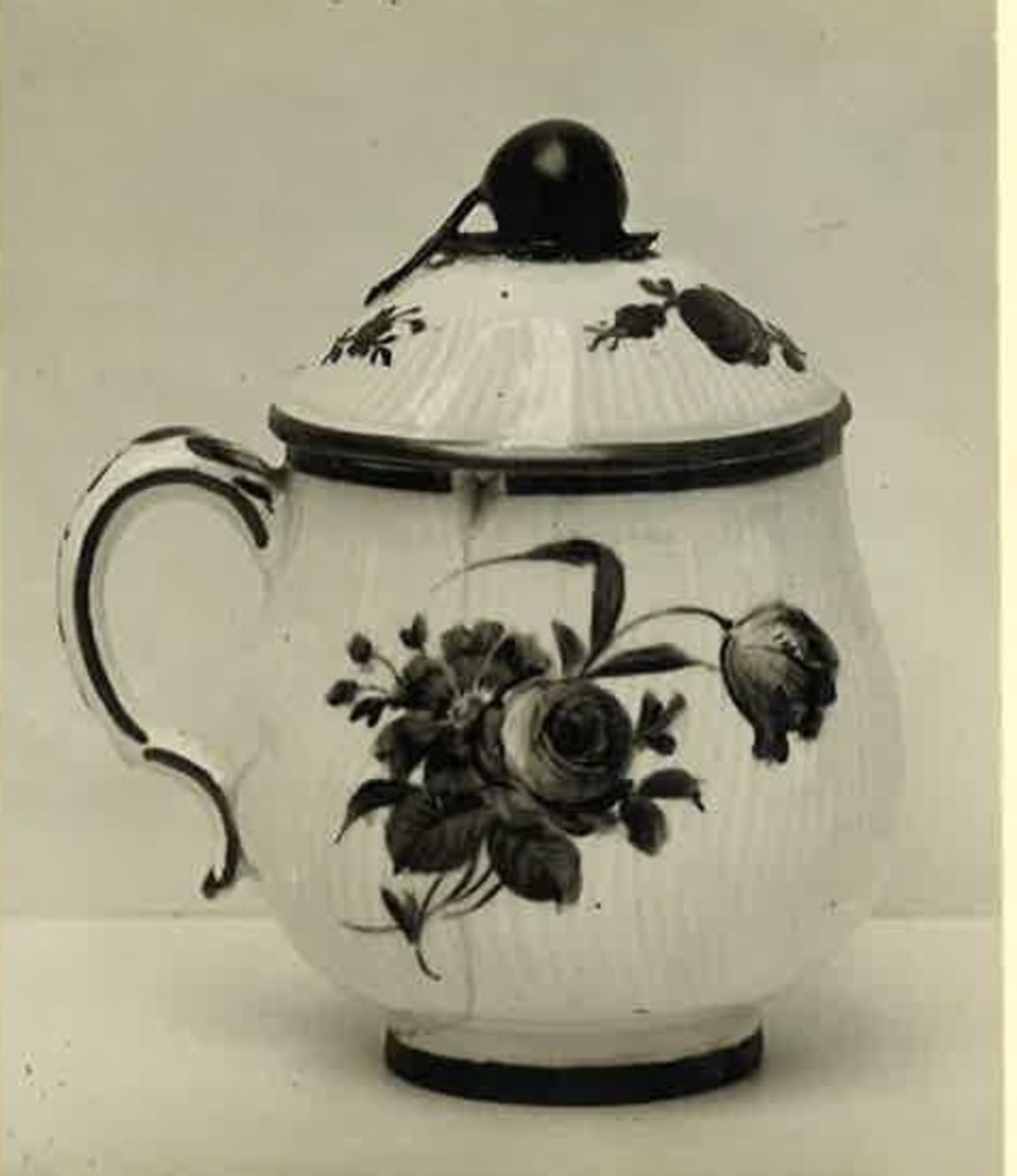 Krämkopp med lock av vitt räfflat porslin med dekor av blå camaïeu-målning och gulddetaljer.