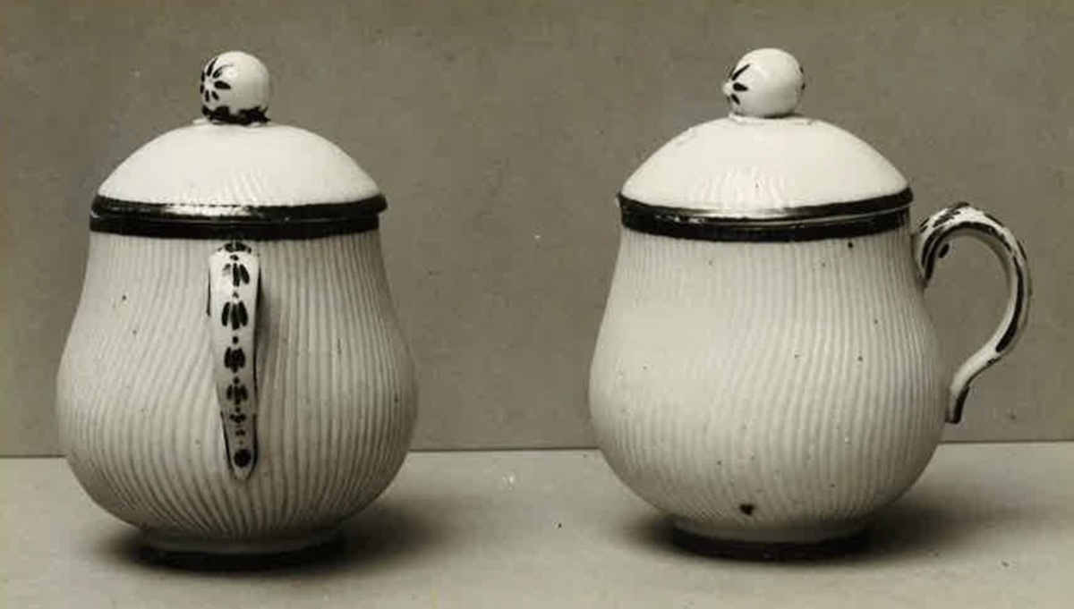 Krämkopp av vitt räfflat porslin med gulddekor.