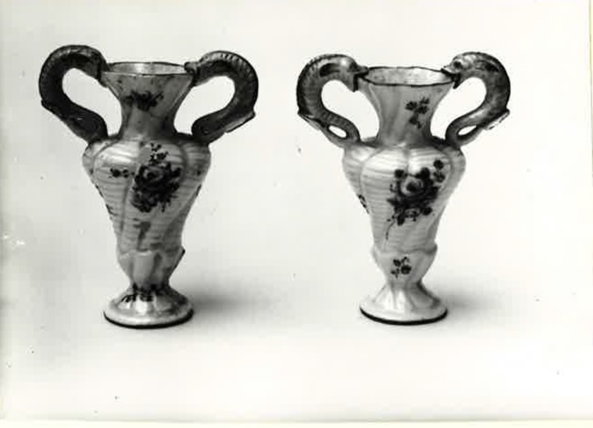 Ett par miniatyrvaser av vitglaserat mjukt porslin med hänklar formade som delfiner. Delfinerna är målade. Polykrom blomdekor.