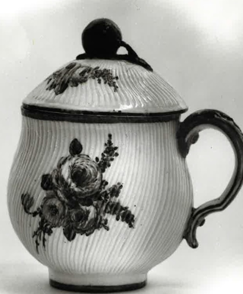 Krämkopp med lock, av porslin. Täta snedräfflor. Lock-knopp i form av en frukt. Blomsterdekorationer, rödvioletta ränder på kanter och hänkel.