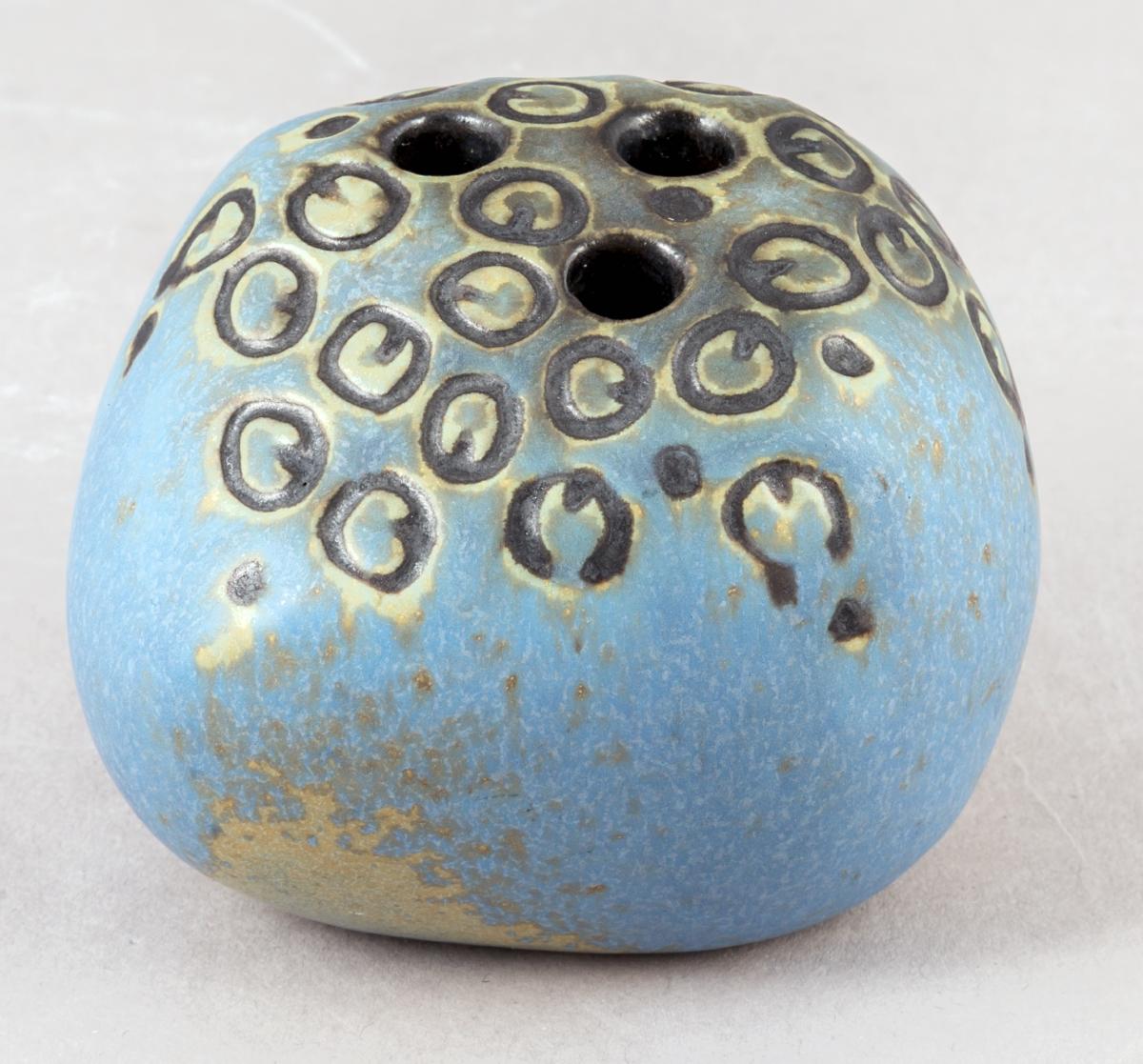 Vas/skulptur i oregelbunden organisk form med reliefdekor, i formgjutet glaserat stengods. Modellen "Blomsten" formgavs för Gustavsbergs porslinsfabrik 1966 under det år då Johnny Rolf och hennes man Jan de Rooden var gästkonstnärer på Gustavsberg.