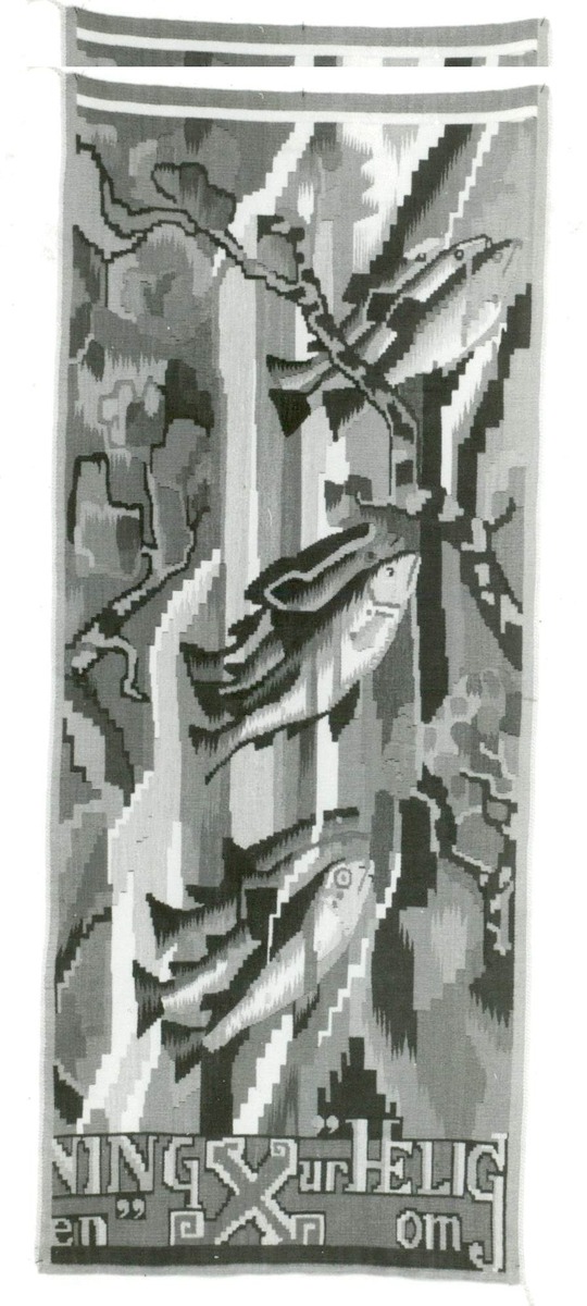 Detalj av en stor bildvävnad beställd för Turiststationen i Storlien. Formgiven av Einar Forseth och vävd av Ulla Cyrus Zetterström på Textilinstitutet i Borås.
