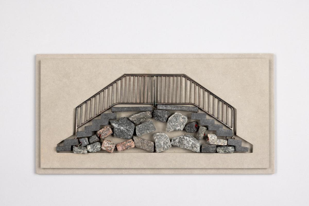 Halssmycke föreställande entrétrappa ur projektet Angående Hus nr 10. Halsbandet är tillverkat av oxiderat silver, diabas och små granitstenar som Mona Wallström pockat runt det verkliga Hus 10).