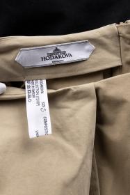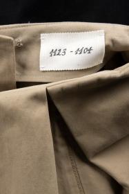 Kompletterande bandknäppning. Och kjol tillverkad av chinos, vända upp och ner. Ellen Hodakova Larsson arbetar återkommande med återbruk.