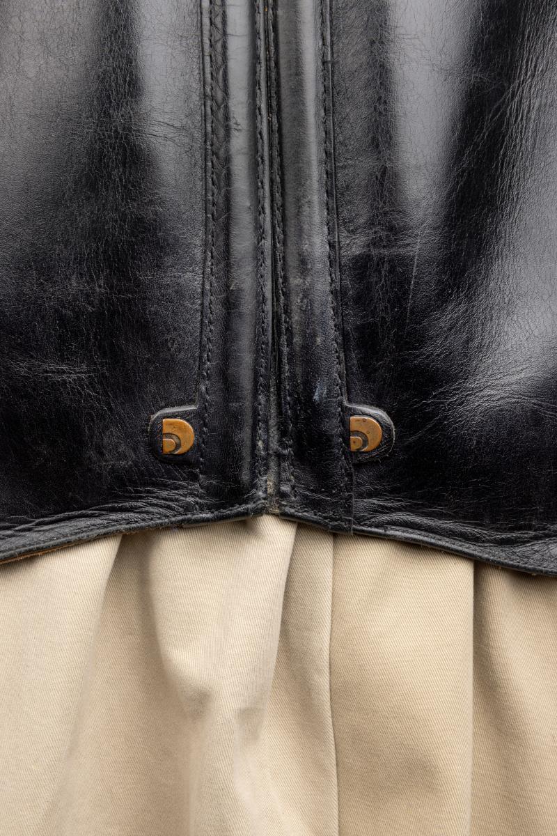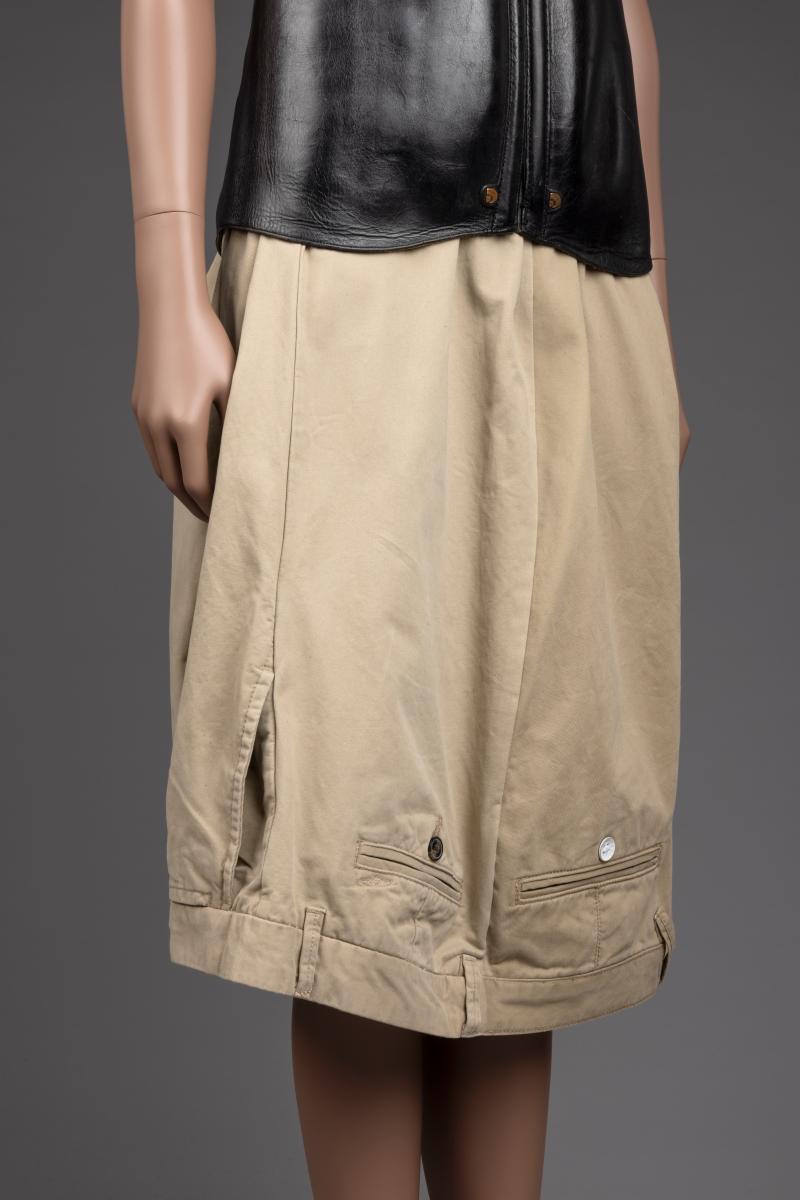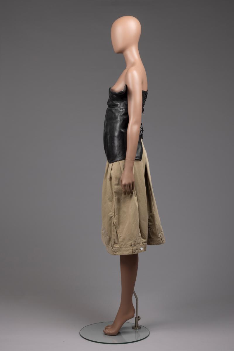Korsett i läder av återvunna ridstövlar och kjol i bommull tillverkad av att par chinos.