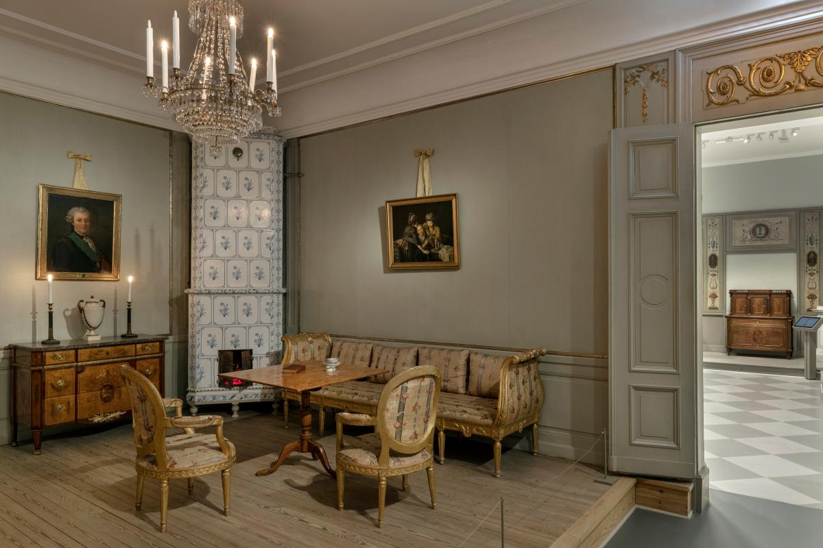 Detta är det andra rummet i utställningen 1700-talets former på våning 2. Här presenteras en autentisk 1700-talsinteriör från en våning i Stockholm. Med stämningsfull belysning och plinkande pianomusik blir besökaren nästan en del av rummet och kan uppleva atmosfären från tidens hem och vardagsliv. Rummet visar detaljerade möbler, textilier och dekorationer som tillsammans ger en levande bild av 1700-talets estetiska ideal och sociala miljöer.