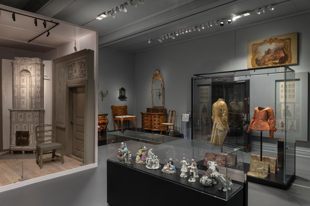 Detta är det första rummet i utställningen 1700-talets former på våning 2. Här visas ett urval av museets omfattande 1700-talssamling med möbler, dräkter, keramik och silver, tillsammans med en interiör från Hökälla Säteri. Besökaren möts av tidstypiska föremål som illustrerar rokokons böljande linjer, en introduktion till århundradets stora variation i form och stil. Föremålen speglar både elegans och praktisk funktion och visar hur design och dekoration varierade mellan olika sociala sammanhang.